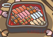 日本の伝統「コタツ」にあたっておすしを食べている家族的な姿のイラスト