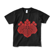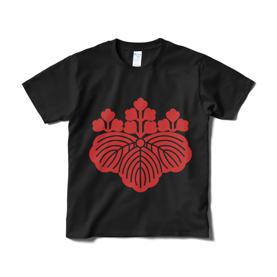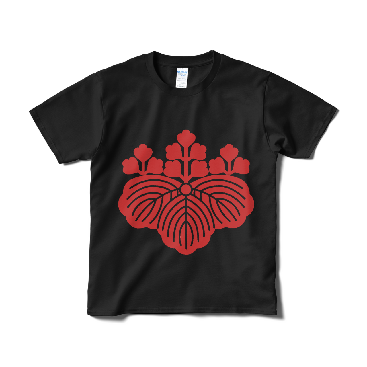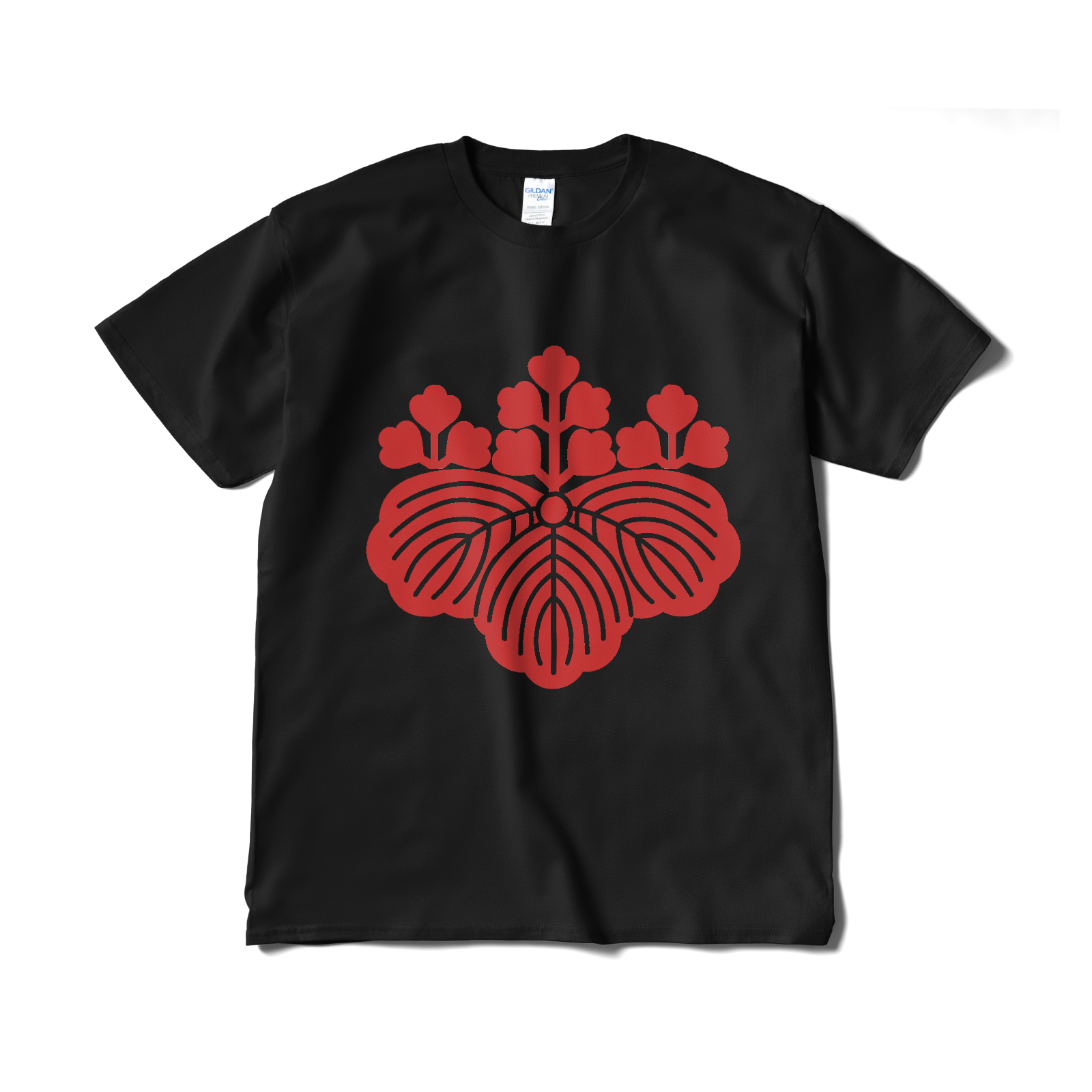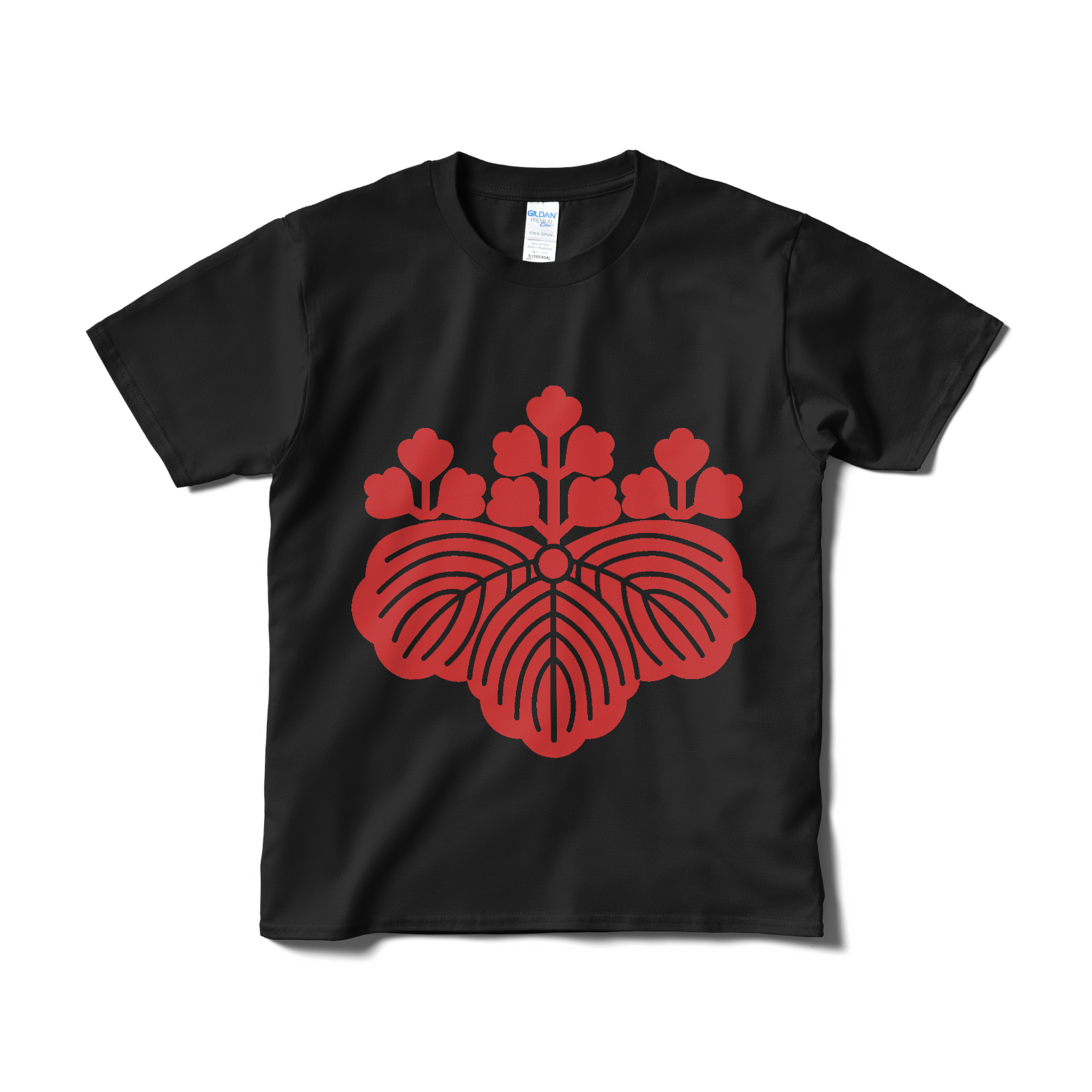 戦国武将 豊臣秀吉の家紋「五三桐」をあしらったTシャツ。織田信長が天皇から下賜されたものを、さらに秀吉に下賜したため。織田信長の紋とも言われています。