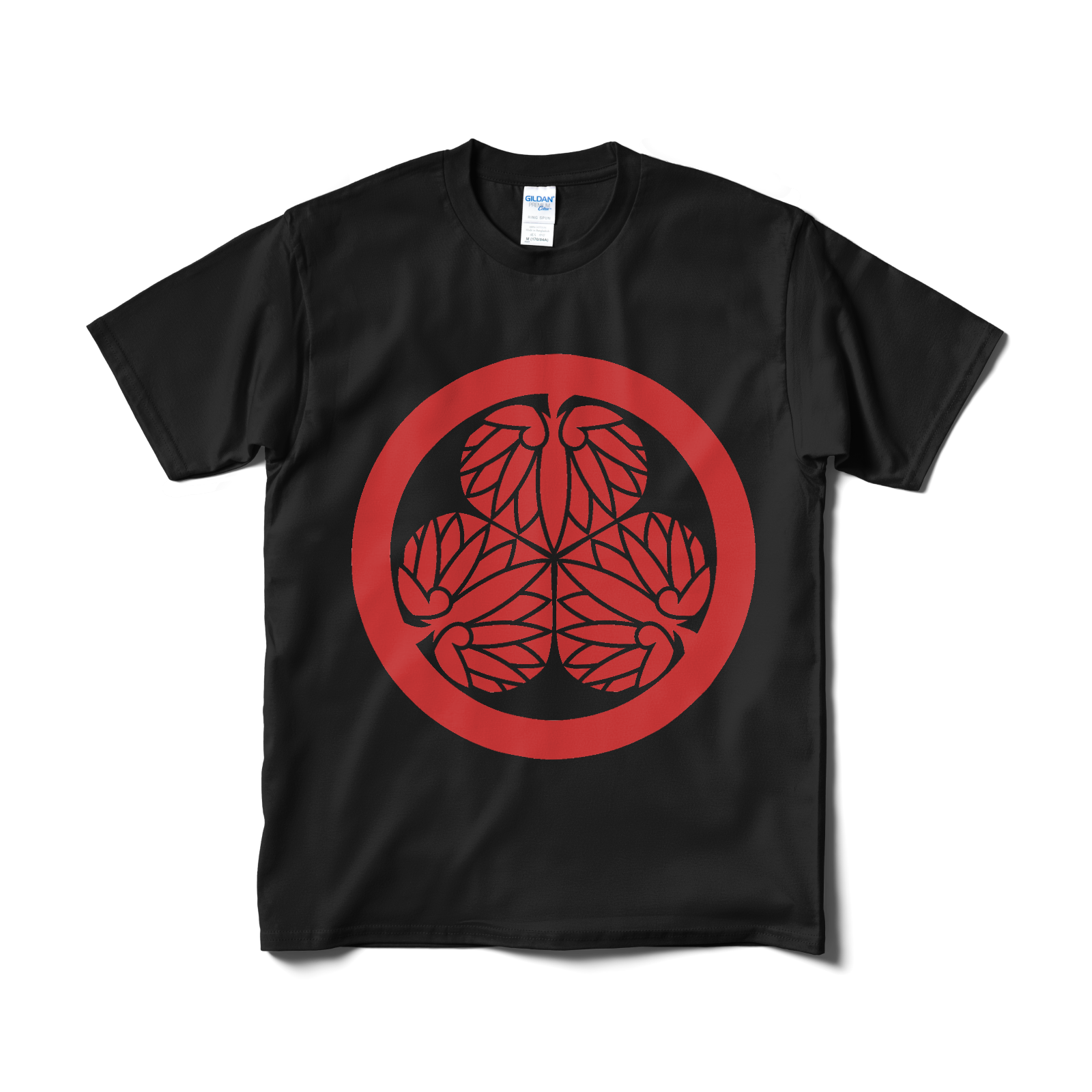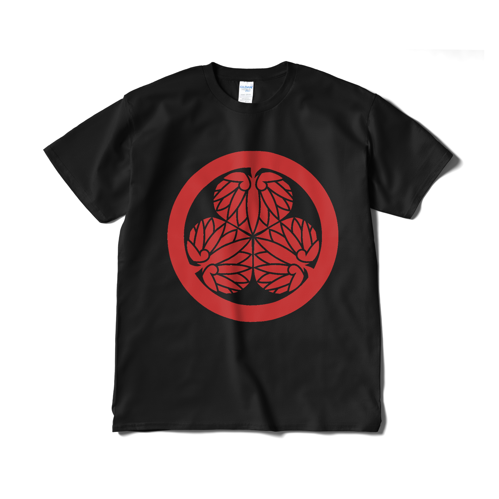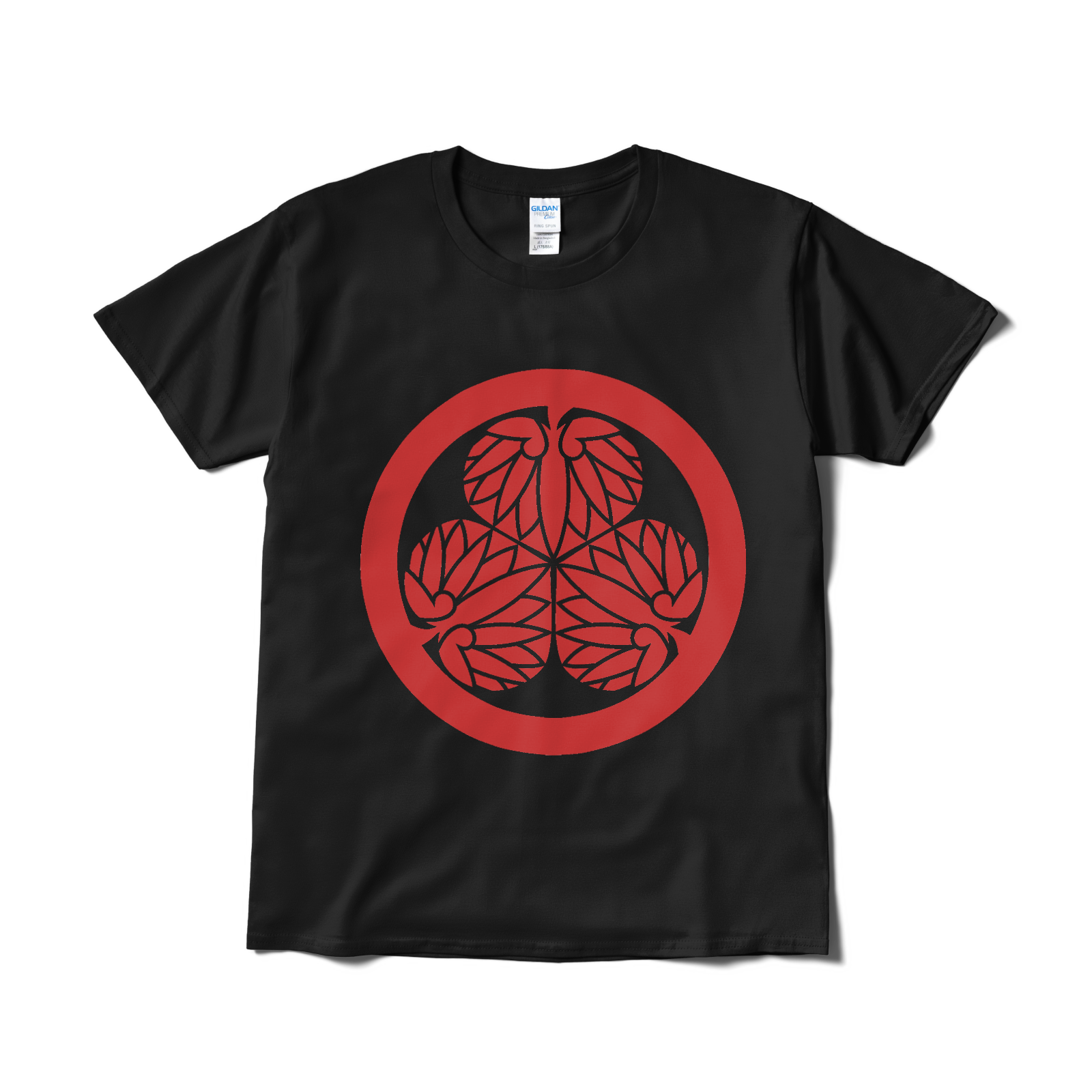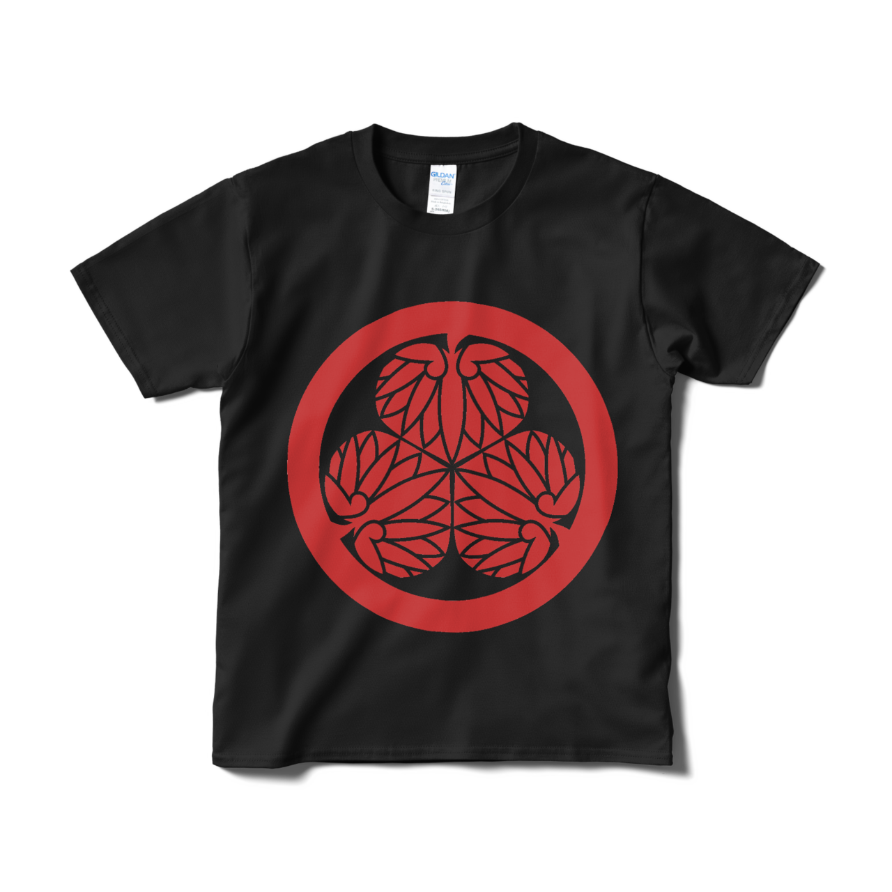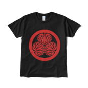 戦国武将 徳川家康の家紋です。水戸黄門で「目に入らぬか」と見せられるあの印籠についているマークとしても有名です。徳川家の「三つ葉葵」をあしらったTシャツ。