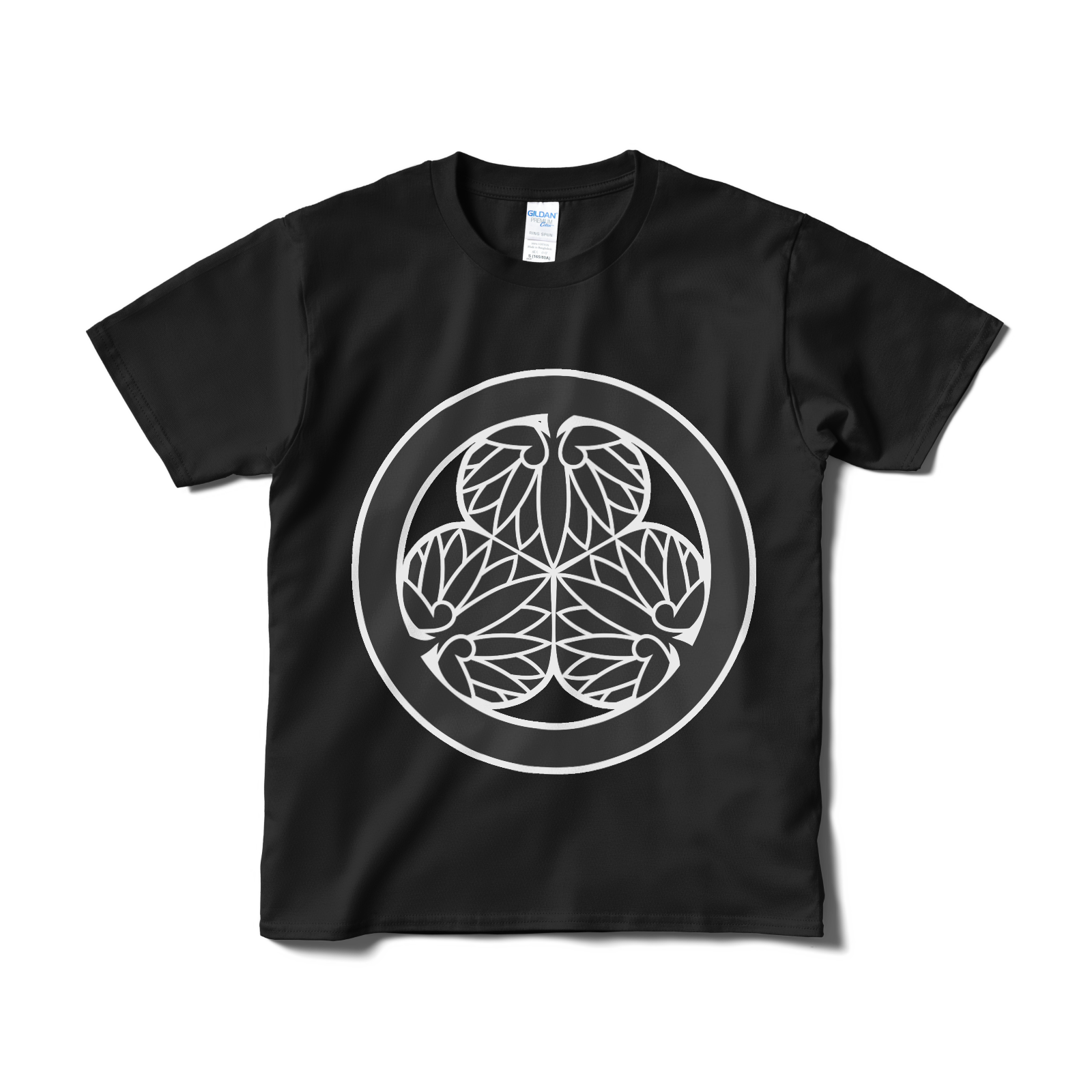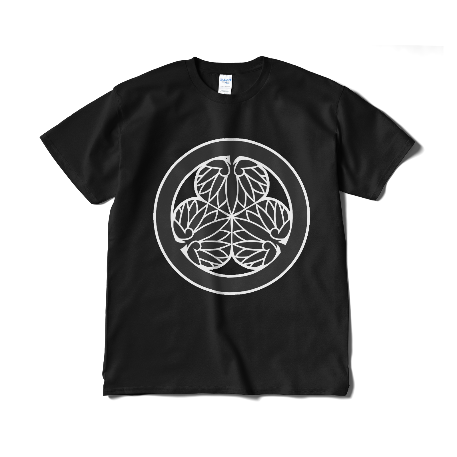 戦国武将 徳川家康の家紋です。水戸黄門で「目に入らぬか」と見せられるあの印籠についているマークとしても有名です。徳川家の「三つ葉葵」をあしらったTシャツ。